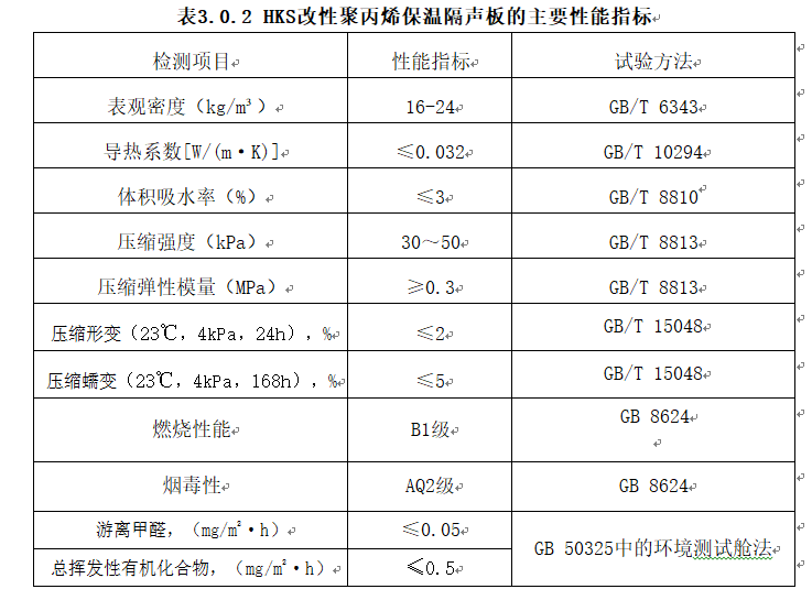 HKS改性聚丙烯保溫隔聲板主要性能指標